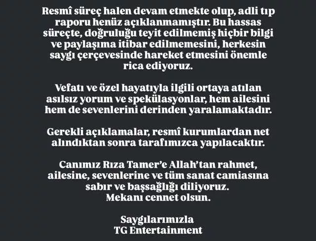 Resmî süreç devam etmekte olup adli tıp raporu henüz açıklanmamıştır. Bu hassas süreçte, doğruluğu teyit edilmemiş bilgi ve paylaşımlara itibar edilmemesini, herkesin saygı çerçevesinde hareket etmesini önemle rica ediyoruz. Vefatı ve özel hayatıyla ilgili spekülasyonlar, ailesini ve sevenlerini derinden yaralamaktadır. Gerekli açıklamalar resmî kurumlardan net bilgiler alındıktan sonra yapılacaktır. Rıza Tamer'e Allah'tan rahmet; ailesine ve sanat camiasına başsağlığı diliyoruz. Mekânı cennet olsun.