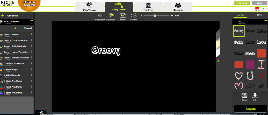 Tr.kizoa.com ile bunları kullanarak slaytlar, videolar, kolajlar hazırlayabilir ve bunu çok hızlı bir şekilde yapabilirsiniz.