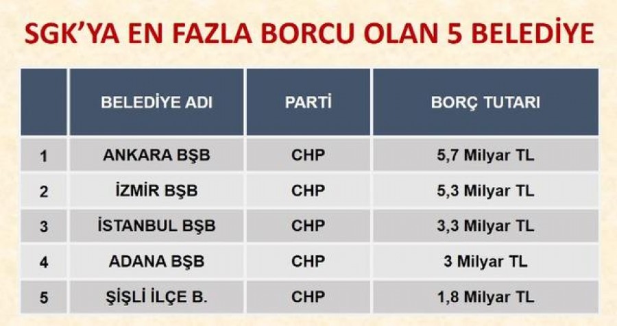 CHP'li belediyeler arasında SGK'ya en fazla borcu olanlar sıralamasında bir numarada Ankara var! Ankara'nın SGK'ya olan borcu 5,7 milyar TL! İzmir Büyükşehir Belediyesinin borcu 5,3 milyar TL!