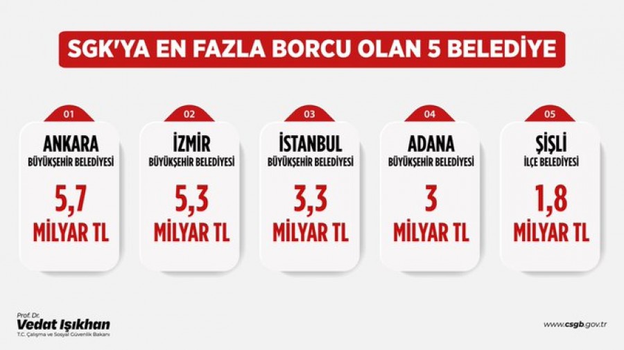 Çalışma ve Sosyal Güvenlik Bakanı Vedat Işıkhan, sosyal medya hesabından Belediyelerin SGK'ya olan prim borçlarını açıkladı.