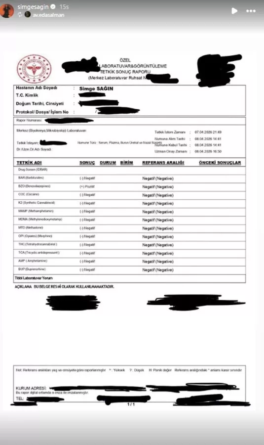 Simge Sağın, özel bir laboratuvarda ayrıca test yaptırdı. Sağın, uyuşturucu test sonucunu da sosyal medya üzerinden takipçileriyle paylaştı. Teste göre Simge Sağın'ın tüm uyuşturucu testleri negatif çıktı.