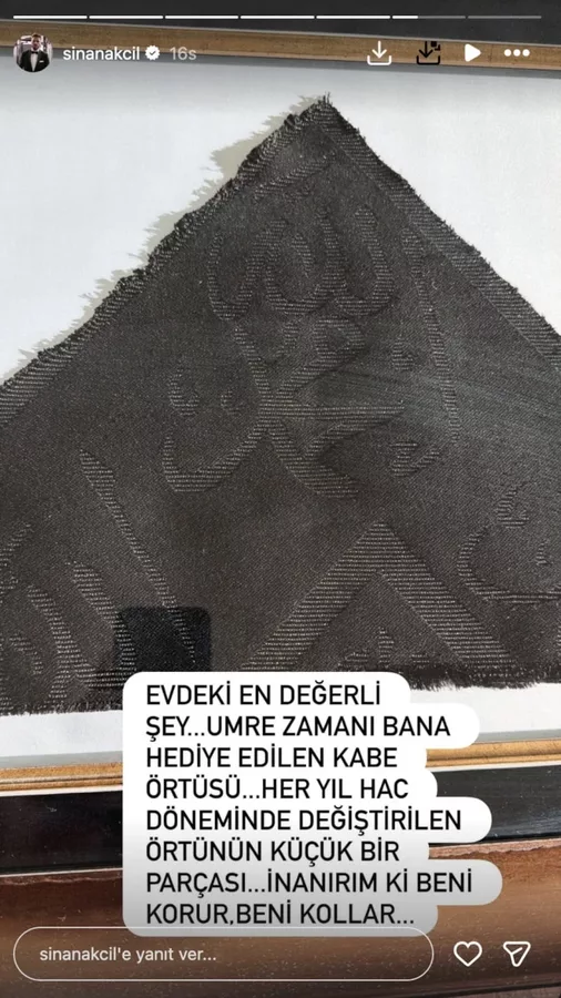 Sinan Akçıl, sosyal medya hesabından yaptığı son paylaşımında evindeki en değerli eşyasını takipçileriyle paylaştı. Evinde Kabe örtüsünden bir parça bulunan şarkıcı, "Evdeki en değerli şey... Umre zamanı bana hediye edilen Kabe örtüsü. Her yıl hac döneminde değiştirilen örtünün küçük bir parçası. İnanırım ki beni korur, beni kollar." dedi.