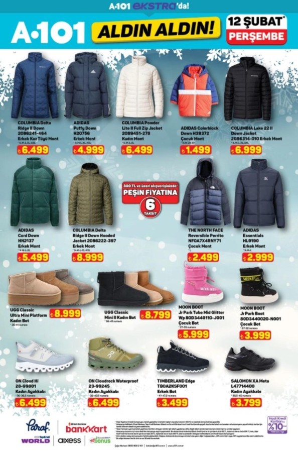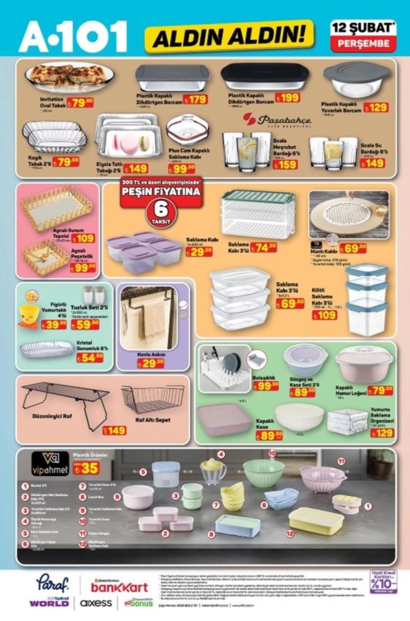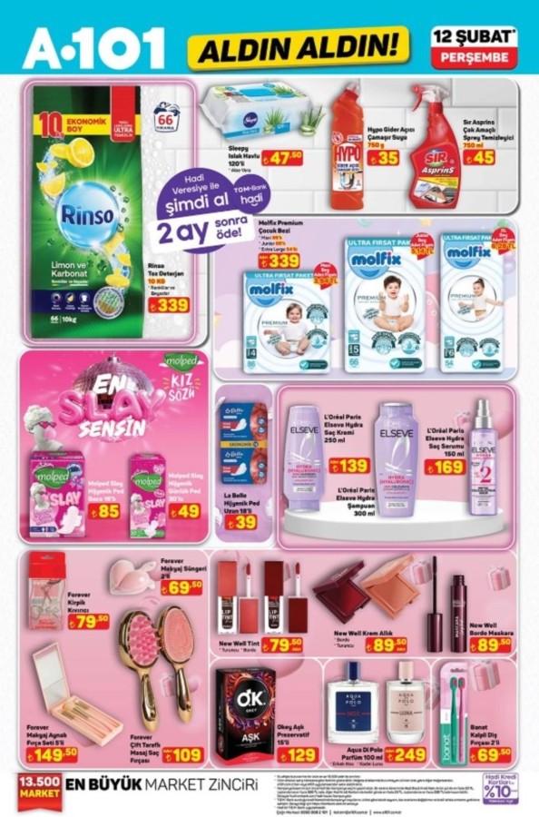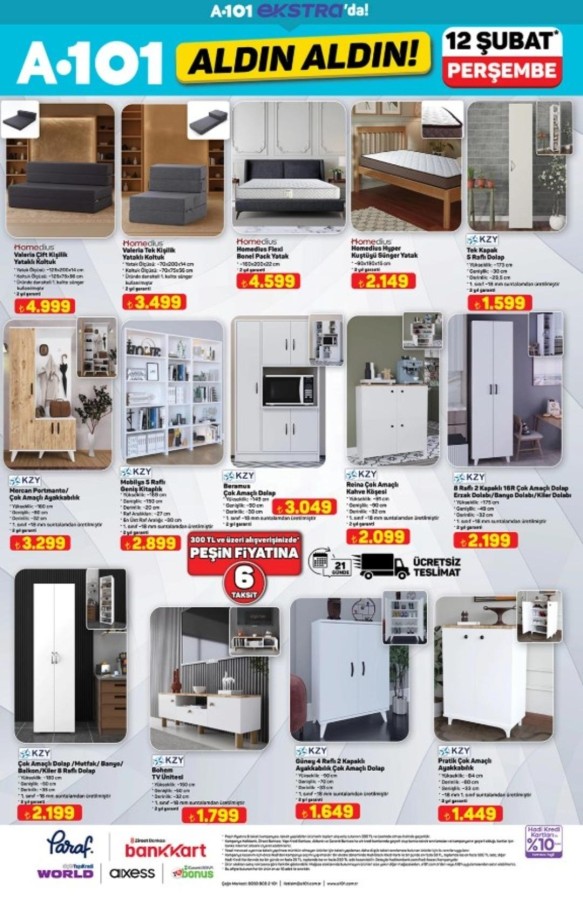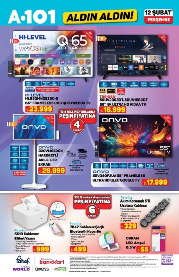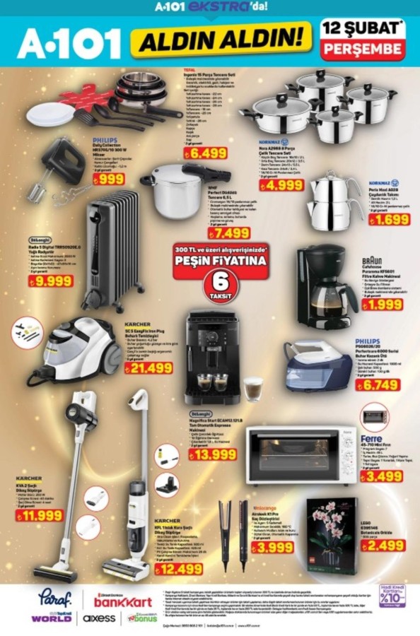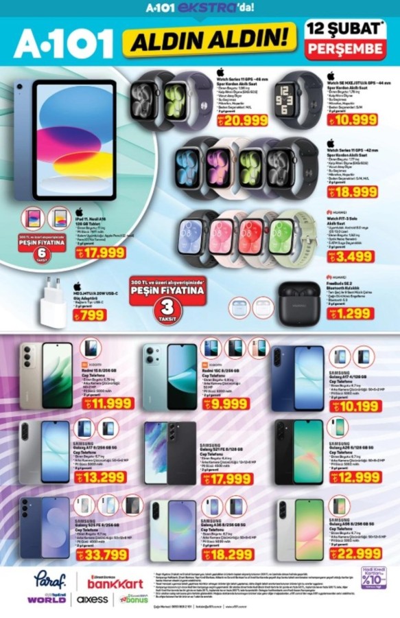 12 Şubat A101 katalog fırsatları alışveriş severlerle buluştu. A101 market raflarında yerini alacak indirimli ürünler, hem fiziksel mağazalarda hem de A101'in online satış kanallarında tüketicilerin beğenisine sunuluyor. A101 aktüel ürünler bu hafta da uygun fiyatları ve geniş ürün yelpazesiyle dikkat çekiyor. A101 12 Şubat aktüel kataloğunda teknoloji ve ev yaşamına yönelik pek çok marka öne çıkıyor. Apple ve Samsung marka akıllı telefonlar ile akıllı saat modelleri teknoloji meraklılarını cezbederken; Hi-Level, Toshiba ve Onvo televizyon seçenekleri farklı bütçelere hitap ediyor. Evini yenilemek isteyenler için ise Homedius ve Kzy markalı yatak, koltuk ve modern dolap modelleri dikkat çekiyor. Şık ve fonksiyonel tasarımlar, uygun fiyat avantajıyla A101 raflarında yer alıyor.