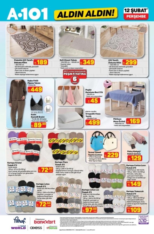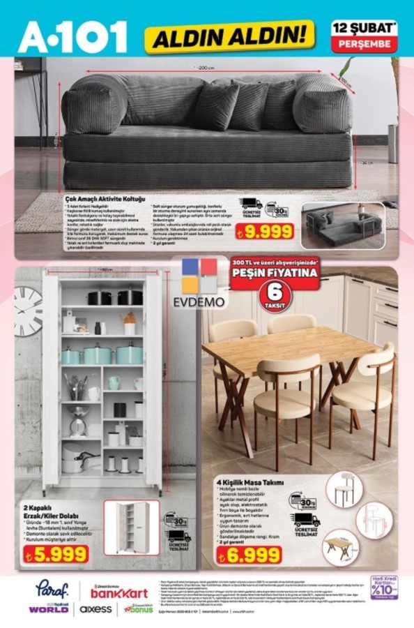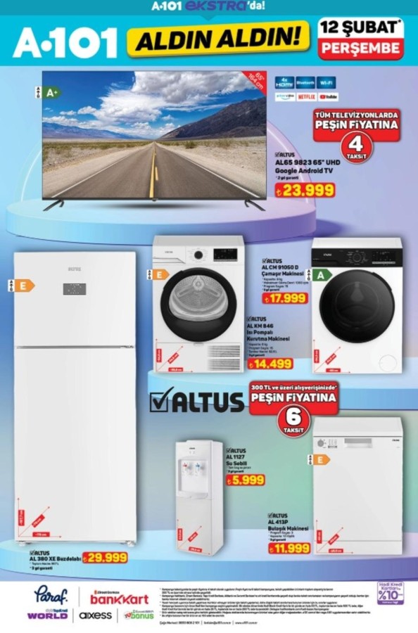 Yaşam, 2026.02.12 10:4412 Şubat A101 katalog fırsatları alışveriş severlerle buluştu. A101 market raflarında yerini alacak indirimli ürünler, hem fiziksel mağazalarda hem de A101'in online satış kanallarında tüketicilerin beğenisine sunuluyor. A101 12 Şubat aktüel kataloğunda teknoloji ve ev yaşamına yönelik pek çok marka öne çıkıyor. Apple ve Samsung marka akıllı telefonlar ile akıllı saat modelleri teknoloji meraklılarını cezbederken; Hi-Level, Toshiba ve Onvo televizyon seçenekleri farklı bütçelere hitap ediyor. Evini yenilemek isteyenler için ise Homedius ve Kzy markalı yatak, koltuk ve modern dolap modelleri dikkat çekiyor. Şık ve fonksiyonel tasarımlar, uygun fiyat avantajıyla A101 raflarında yer alıyor. İşte 12 Şubat A101 Aktüel Kataloğu...