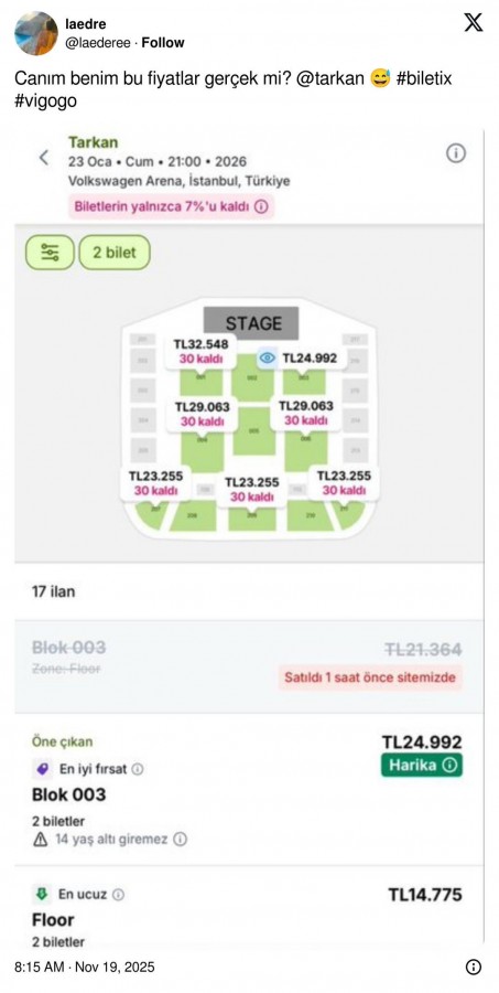 Bilet almak için sayfaya girenler fiyatları görünce de şaşkınlık yaşadı. En uygun fiyatların 14 bin 775 TL'den başladığı görüldü.