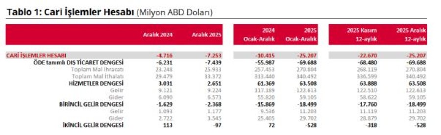 TCMB, Aralık 2025 dönemine ilişkin ödemeler dengesi gelişmelerini açıkladı. Buna göre; aralık ayında cari işlemler hesabı 7 milyar 253 milyon dolar açık kaydetti. Altın ve enerji hariç cari işlemler hesabı 691 milyon dolar açık verdi. Ödemeler dengesi tanımlı dış ticaret açığı 7 milyar 439 milyon dolar olarak gerçekleşti. Yıllıklandırılmış verilere göre; aralık ayında cari açık yaklaşık 25,2 milyar dolar olurken, ödemeler dengesi tanımlı dış ticaret dengesi de 69,7 milyar dolar açık verdi.