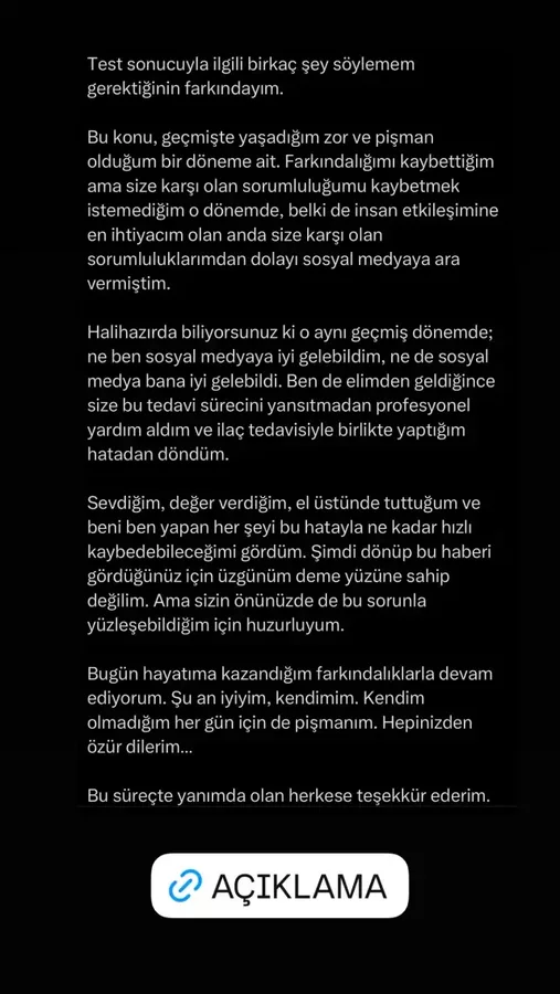 Açıklamasında test sonucuna ilişkin konuşması gerektiğinin farkında olduğunu ifade eden fenomen müzisyen, söz konusu durumun "geçmişte yaşadığı zor ve pişman olduğu bir döneme ait" olduğunu belirtti. O süreçte farkındalığını kaybettiğini ancak takipçilerine karşı sorumluluk duygusunu kaybetmek istemediğini dile getirdi. Sosyal medyaya ara verdiği döneme de değinen sanatçı, "Ne ben sosyal medyaya iyi gelebildim, ne de sosyal medya bana iyi gelebildi" ifadelerini kullandı.