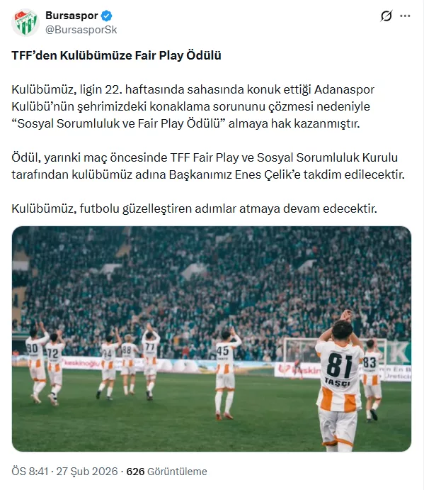Bursaspor'un resmi sosyal medya hesabından yapılan paylaşımda ligin 22. haftasında konuk ettiği Adanaspor'un konaklama sorununu çözmesi nedeniyle "Sosyal Sorumluluk ve Fair Play Ödülü" almaya hak kazanıldığı açıklandı.