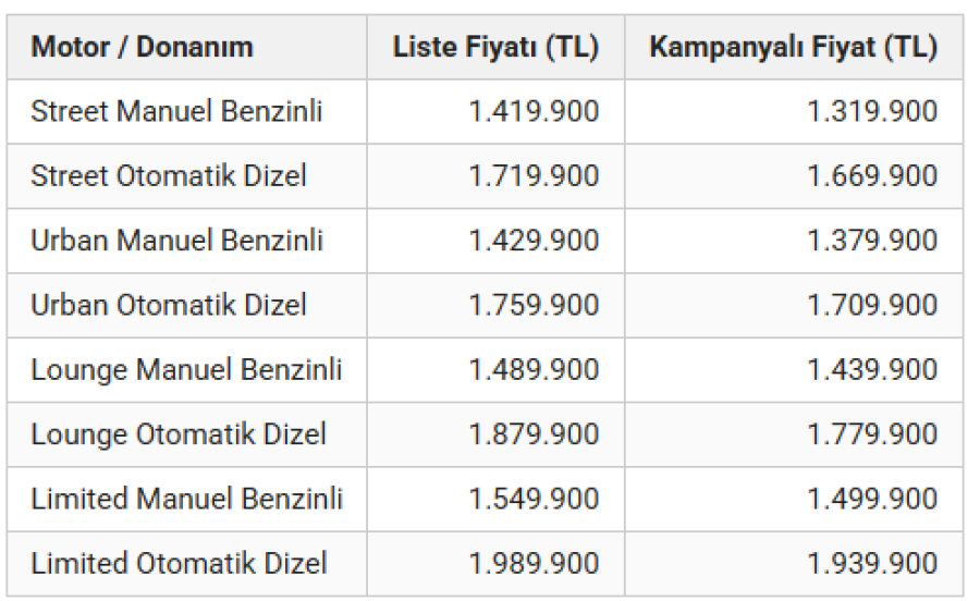 TOPOLİNO 2026 MODEL YILI GÜNCEL FİYAT LİSTESİ (LİSTE FİYATI-KAMPANYALI FİYAT)