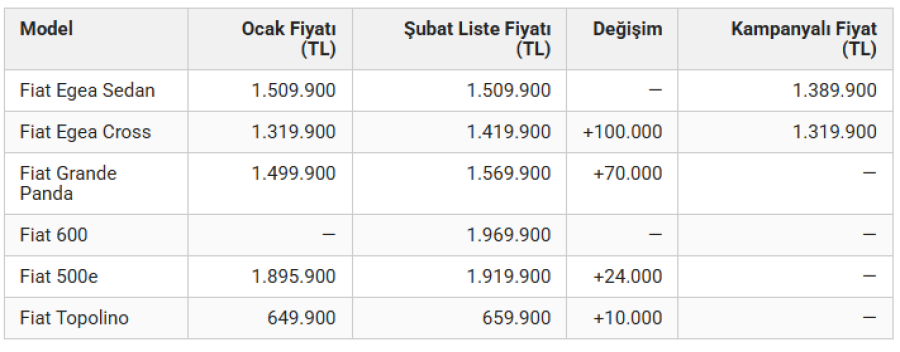 Ocak ayında gelen büyüm zamların ardından Fiat 2026 yılı Şubat ayı fiyat listesinde de zamlı fiyatlara yer verdi. İşte 2026 model yılıyla satışta olan Egea Sedan, Egea Cross, Grande Panda, modellerinin güncel fiyatları...