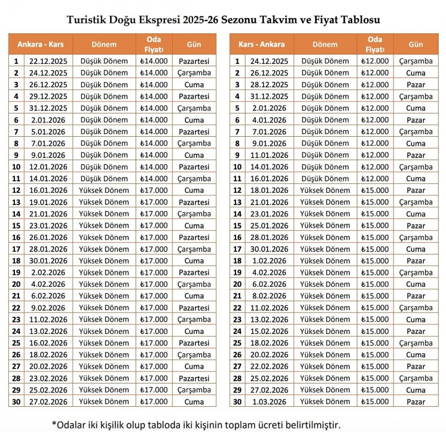 Bakan Uraloğlu, "Turistik Doğu Ekspresi'nin 2025-2026 kış sezonu seferleri 22 Aralık'ta başlayacak, 1 Mart 2026'ya kadar devam edecek. Trenimiz, Ankara-Kars hattında 22 Aralık 2025-27 Şubat 2026 döneminde pazartesi, çarşamba ve cuma, Kars-Ankara yönünde ise 1 Mart 2026'ya kadar çarşamba, cuma ve pazar olmak üzere toplam 60 sefer yapacak." değerlendirmesinde bulundu.