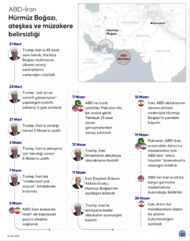 Öte yandan, ABD ve İsrail'in 28 Şubat'ta İran'a yönelik saldırılarıyla başlayan süreçte 8 Nisan'da geçici ateşkes sağlanmış, 11 Nisan'da Pakistan'da gerçekleştirilen kalıcı ateşkes görüşmeleri ise yaklaşık 21 saat sürmesine rağmen sonuçsuz kalmıştı.