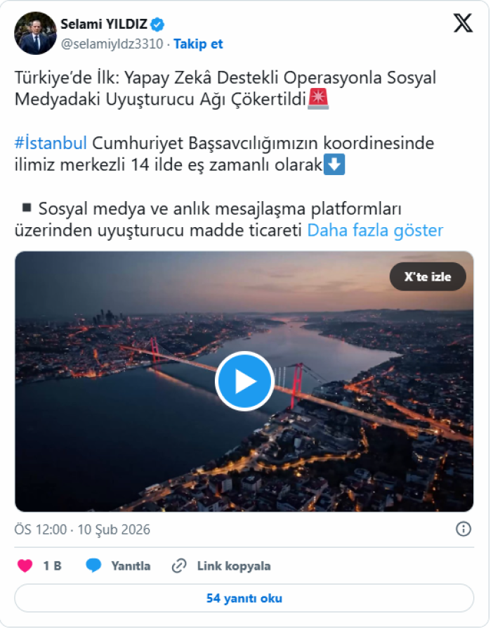 "Türkiye'de İlk: Yapay Zekâ Destekli Operasyonla Sosyal Medyadaki Uyuşturucu Ağı Çökertildi. İstanbul Cumhuriyet Başsavcılığımızın koordinesinde ilimiz merkezli 14 ilde eş zamanlı olarak sosyal medya ve anlık mesajlaşma platformları üzerinden uyuşturucu madde ticareti yapan şahıslara yönelik, yapay zekâ destekli analiz sistemlerinden yararlanılarak gerçekleştirilen operasyonlarda