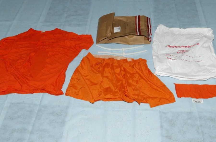 *Epstein'ın üstündeyken kesildiği ve daha sonra hastaneden kişisel eşyalar çantasında iade edildiği öne sürülen gömlek.
