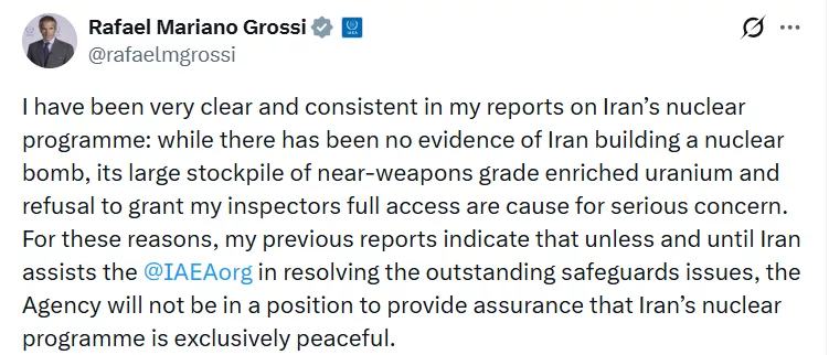 UAEA Başkanı Grossi, İran'ın nükleer bomba ürettiğine dair bir kanıtın bulunmadığını yineledi