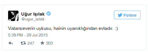 Işılak gelişmeler üzerine Twitter'den yazdığı mesajda "Vatanseverin uykusu, hainin uyanıklığından evladır" dedi.