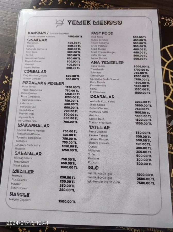 Menüde en ucuz yiyecek 250 TL ile mezeler oldu. En ucuz ana yemek 750 TL'den başlarken Skadi Kebap 3600 TL'den satılıyor. Menemen fiyatları da 400 TL olurken mekanda tost yemek isteyenler de 500 TL ödüyor.