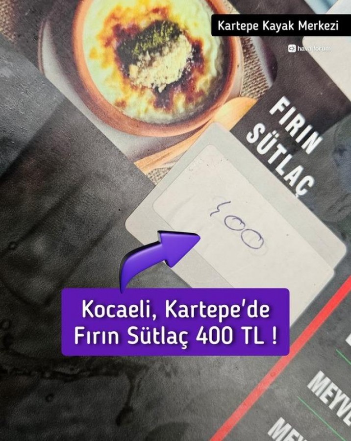 Uludağ'daki fiyatlar sosyal medyanın gündemindeyken Kocaeli Kartepe kayak merkezinde de bir porsiyon sütlacın 400 TL olması dikkat çekti.