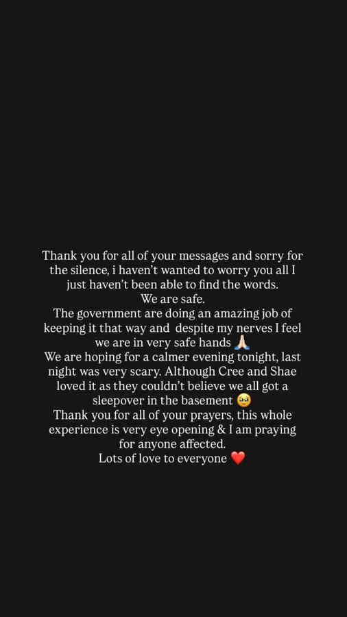 Instagram üzerinden takipçilerine seslenen Kate Ferdinand, "Çok korkutucu bir gece geçirdik. Bodrumda uyuduk ama güvendeyiz" dedi. Ayrıca, "Hükümet bu konuda harika bir iş çıkarıyor ve çok güvendeyim. Dualarınız için teşekkürler, bu deneyim herkese ders oldu" ifadelerini kullandı.