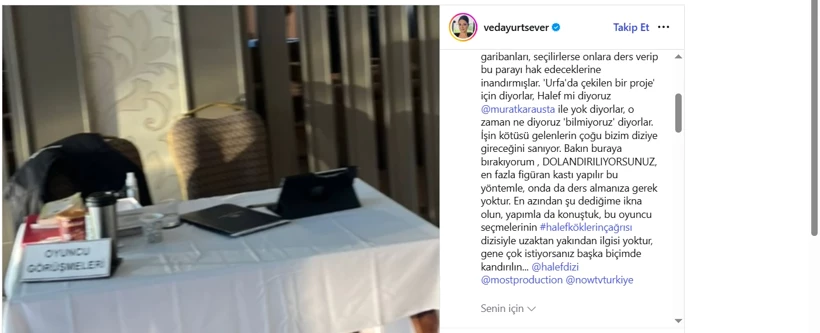 "Halef: Köklerin Çağrısı" dizisinde "Sultan" karakterine hayat veren oyuncu Veda Yurtsever, sosyal medya hesabından yaptığı paylaşımda, dolandırıcılık girişimlerine dikkat çekti. Yurtsever, bir proje için yapılan oyuncu seçmelerinde sahte kayıt parası alındığını belirterek, vatandaşları uyardı. Paylaşımında, "Asansörden indim, karşımda bu masa... Elbette bizim diziye eleman alınacak sandım ve şirinlik yapıp, 'Bana göre rol var mı?' diye sordum. Sadece görevli olduğunu söyleyen bu yüzden de sorduğum hiçbir soruya cevap veremeyen arkadaş beni tanımadı. Tuhaf bulup içeri geçtim; onlarca insan gelmişti. Bu kayıtlardan 12 bin lira alınacağını öğrenince, içimde yaşayan on kaplan gücündeki Fantom dışarı çıktı" ifadelerini kullandı.