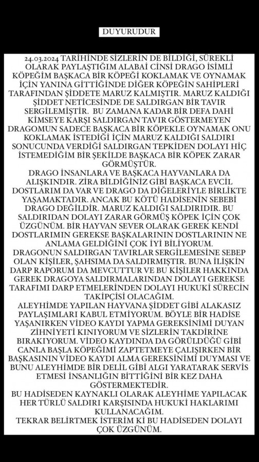 "24.03.2024 tarihinde sizlerin de bildiği, sürekli olarak paylaştığım alabai cinsi Drago isimli köpeğim başkaca bir köpeği koklamak ve oynamak için yanına gittiğinde diğer köpeğin sahipleri tarafından şiddete maruz kalmıştır. Maruz kaldığı şiddet neticesinde de saldırgan bir tavır sergilemiştir. Bu zamana kadar bir defa dahi kimseye karşı saldırgan tavır göstermeyen Drago'mun sadece başkaca bir köpekle oynamak onu koklamak istediği için maruz kaldığı saldırı sonucunda verdiği saldırgan tepkiden dolayı hiç istemediğim bir şekilde başkaca bir köpek zarar görmüştür. Drago insanlara ve başkaca hayvanlara da alışkındır. Zira bildiğiniz gibi başkaca evcil dostlarım da var ve Drago da diğerleriyle birlikte yaşamaktadır. Ancak bu kötü hadisenin sebebi Drago değildir. Maruz kaldığı saldırıdır.