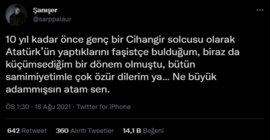Magazin, 2021.08.17 01:28'Şanışer' sahne adıyla bilinen rap sanatçısı Sarp Palaur, sosyal medya hesabından Mustafa Kemal Atatürk içerikli bir paylaşım yaptı. "Bir Cihangir solcusu olarak Atatürk'ün yaptıklarını faşistçe bulduğum bir dönem oldu" diyen ünlü rapçi, "Özür dilerim... Ne büyük adammışsın Atam sen" dedi.