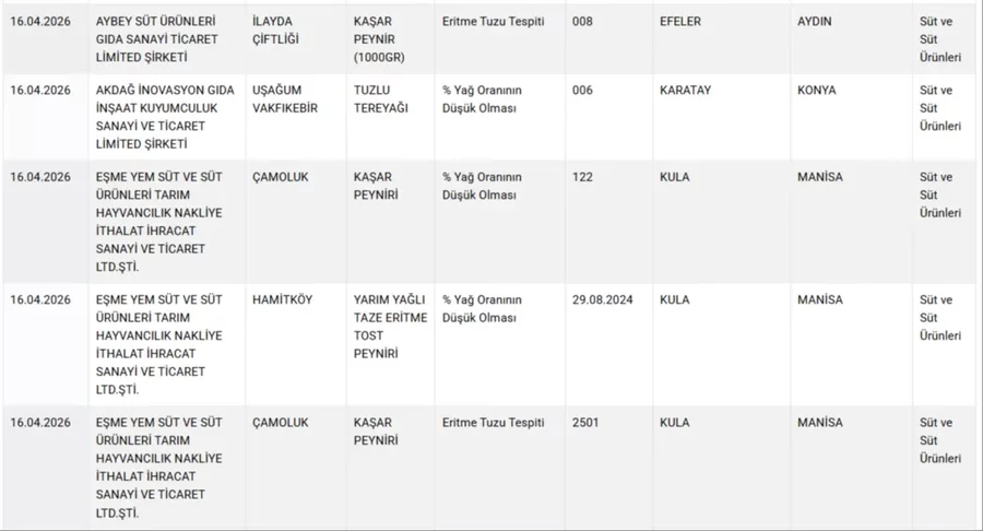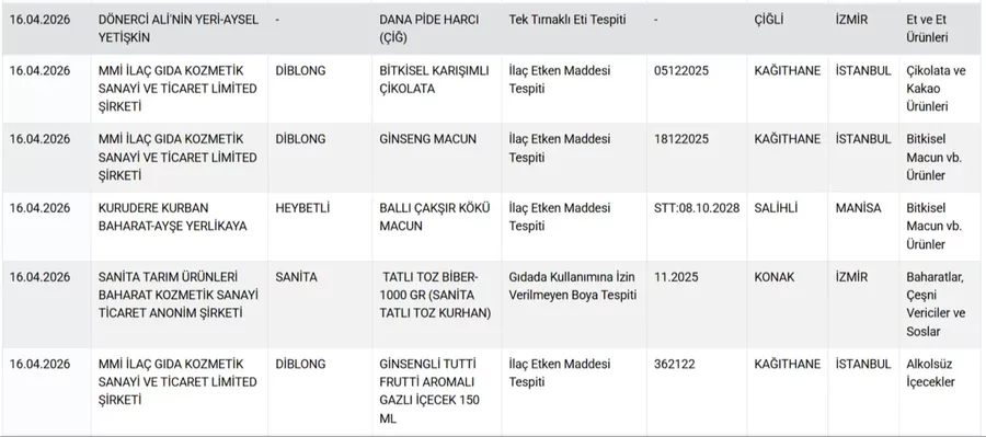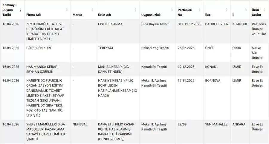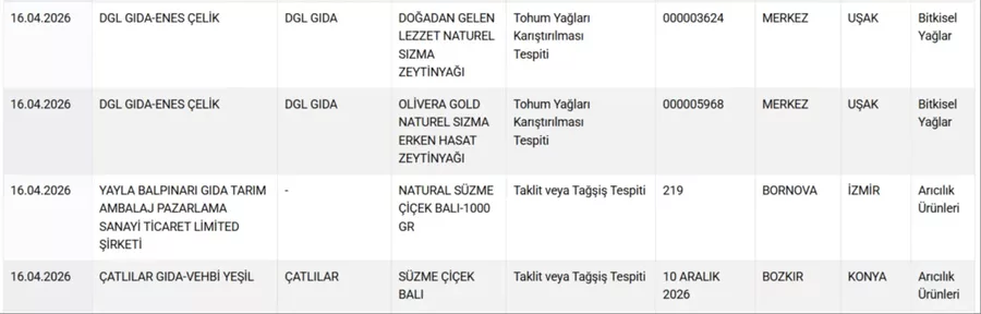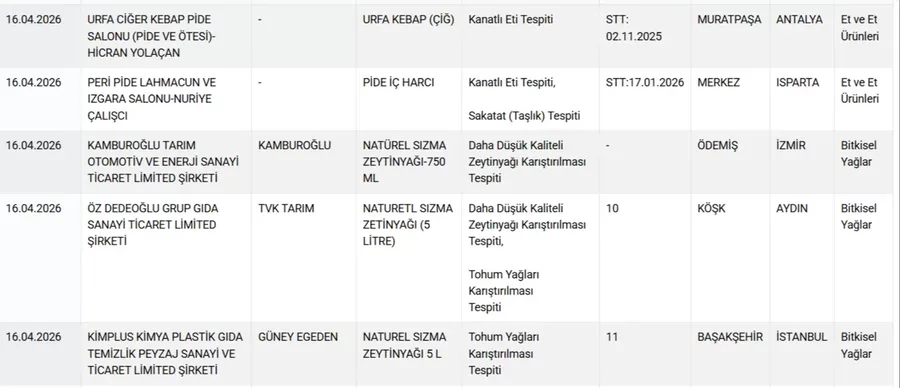 Bakanlık gıdada hile yapan firmaları ve ürünlerin yer aldığı listeyi bir kez daha güncelledi. 16 Nisan tarihli listede bal, zeytinyağı, pide, kaşar, baharat, tatlı, tereyağı, kebap, köfte ve sucuk gibi ürünler yer aldı.