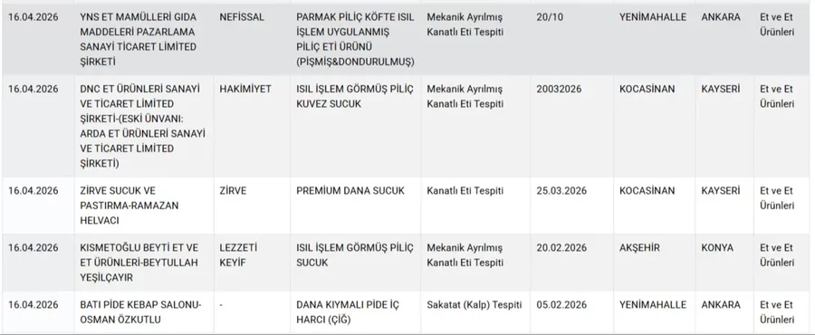 Ekonomi, 2026.04.17 10:16Tarım ve Orman Bakanlığı, gıda denetimlerine Türkiye genelinde aralıksız devam ediyor. 81 ilde yapılan denetimler, "guvenilirgida.tarimorman.gov.tr" adresi üzerinden kamuoyu ile paylaşılıyor. Söz konusu liste bir kez daha güncellenirken, gıdada bir at ve eşek eti skandalı daha ortaya çıktı.