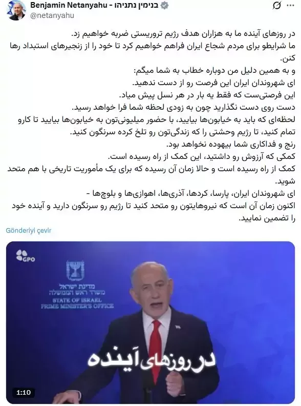 Sözlerinin devamında "Güçlerimizi birleştirelim" çağrısı yapan Netanyahu, "Uzun zamandır beklediğiniz yardım geldi. Yardım geldi ve şimdi tarihi bir görev için birleşme zamanı. Ey İran vatandaşları, Parsiler, Kürtler, Azeriler, Ahvaziler ve Beluçlar! Rejimi devirmek ve geleceğinizi güvence altına almak için güçlerinizi birleştirmenin tam zamanı" ifadelerini kullandı.