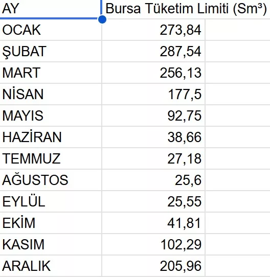BOTAŞ'ın yayınladığı verilere göre, Bursa'daki iklim koşulları ve tüketim alışkanlıkları baz alınarak her ay için farklı limitler belirlendi. Bursa'daki konut tüketicileri için belirlenen aylık tüketim sınırları şu şekilde: