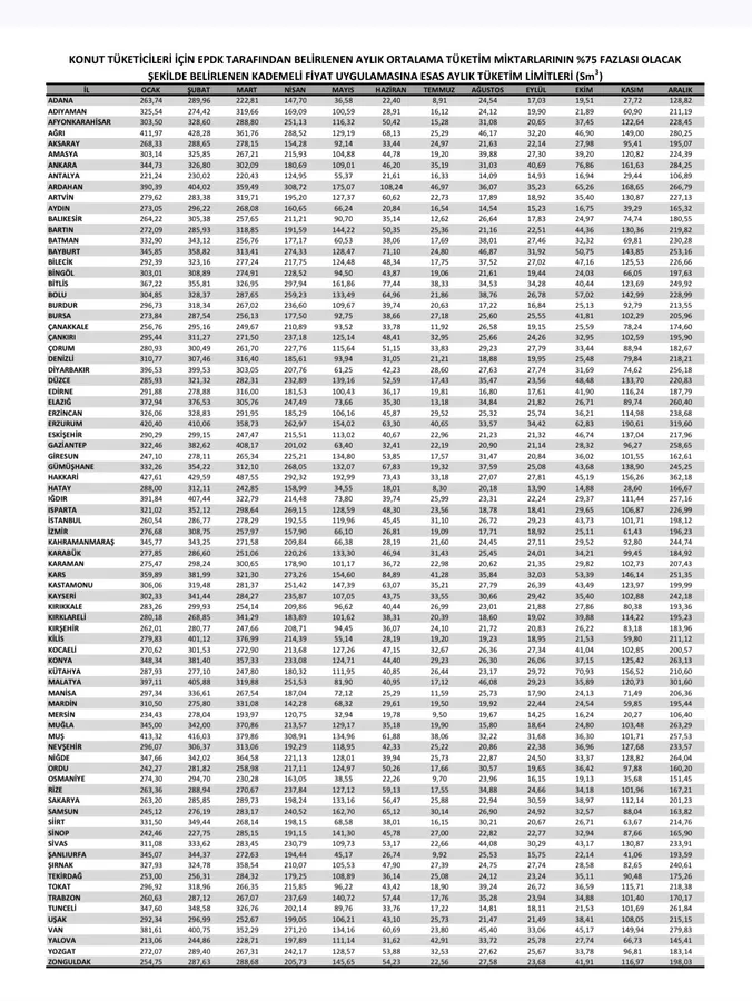 Her il için belirlenen aylık ortalama tüketim miktarlarının yüzde 75 fazlası olduğu belirtiliyor. Yani tablodaki tüketim miktarları o ilin normal aylık ortama tüketim miktarının yüzde 75 aşılmış miktarını gösteriyor.