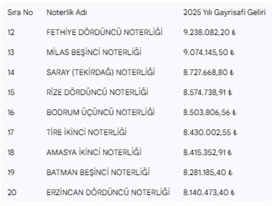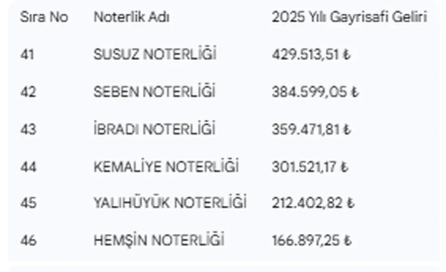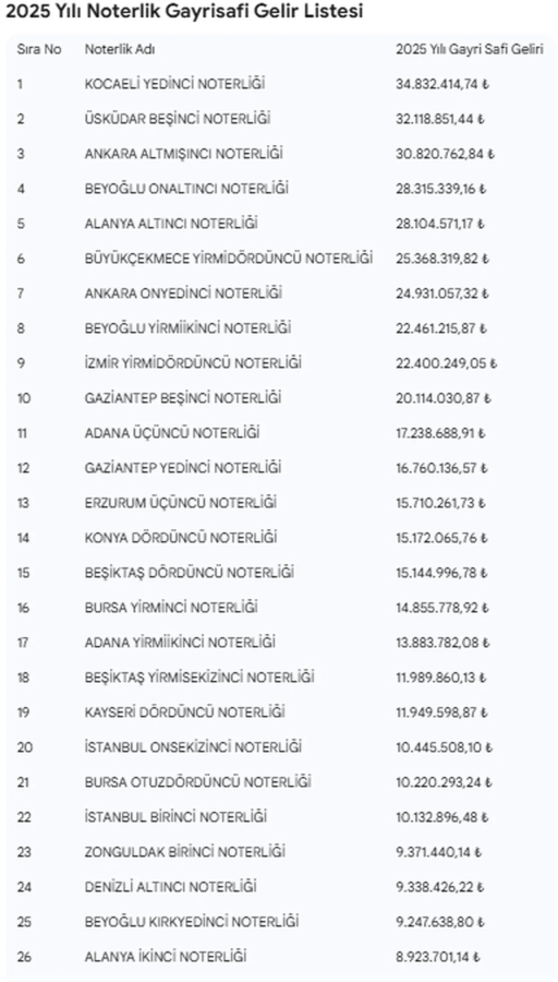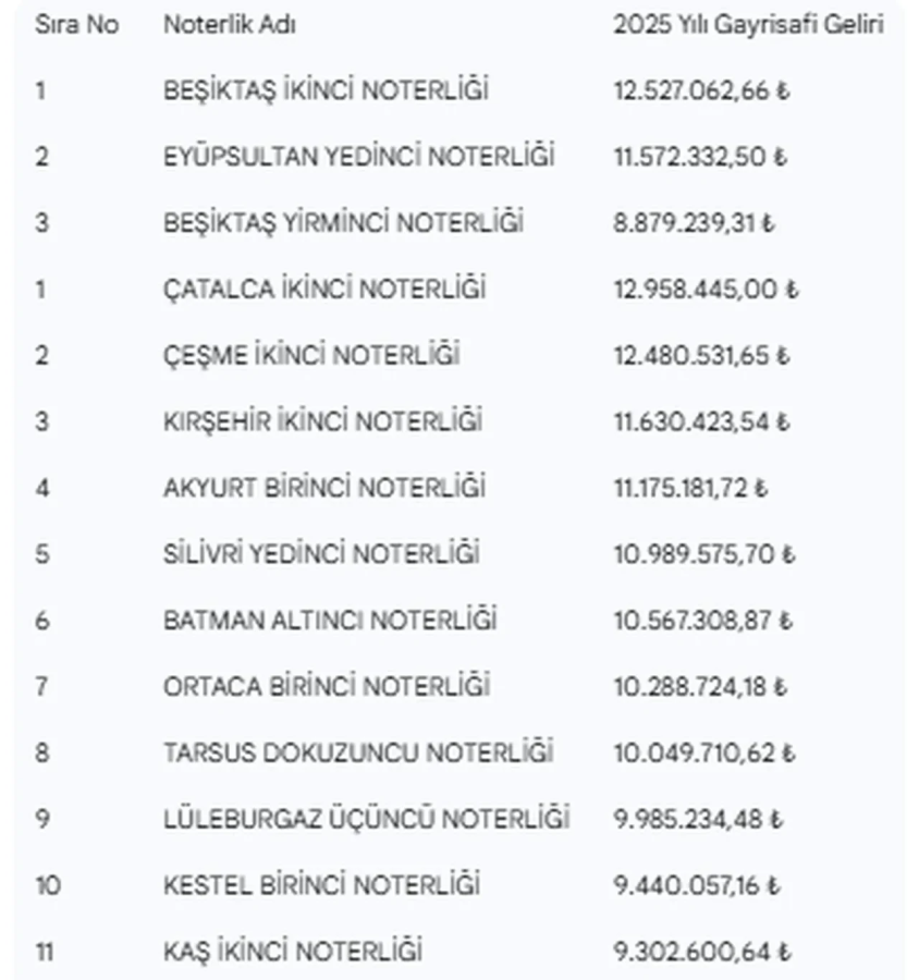 NTV'nin haberine göre, boş bulunan noterliklere talip olacaklar bir yıl içinde ortalama olarak ne kadar kazanacaklarını tahmin etmeleri için Adalet Bakanlığı 2025 yılı gayri safi gelirlerini açıkladı. 162 noterin toplam 2025 yılı geliri 1,3 milyar lirayı aştı.
