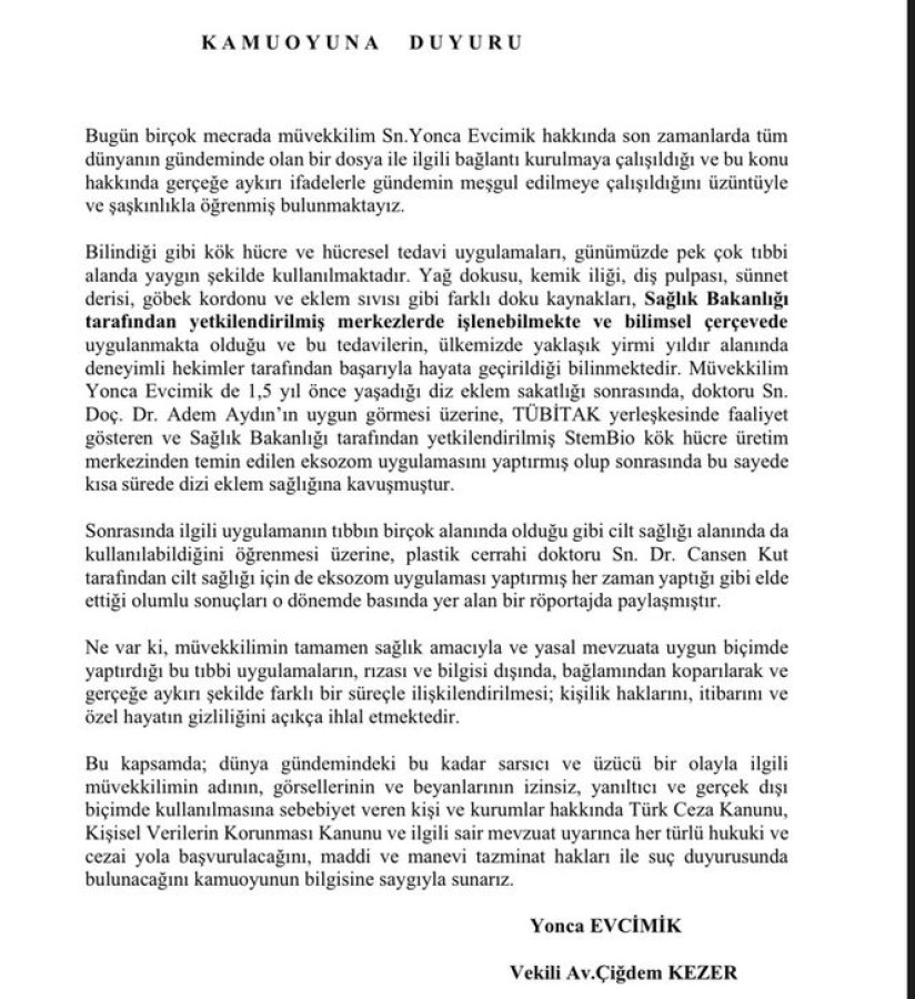 Müvekkilimiz Yonca Evcimik, yaklaşık 1,5 yıl önce yaşadığı diz eklem sakatlığı sonrasında, doktoru Doç. Dr. Adem Aydın'ın uygun görmesi üzerine; TÜBİTAK yerleşkesinde faaliyet gösteren ve Sağlık Bakanlığı tarafından yetkilendirilmiş StemBio Kök Hücre Üretim Merkezi'nden temin edilen eksozom uygulamasını yaptırmıştır. Sonrasında söz konusu uygulamanın cilt sağlığı alanında da kullanılabildiğini öğrenmesi üzerine, plastik cerrahi uzmanı Dr. Cansen Kut tarafından cilt sağlığı amacıyla eksozom uygulaması yaptırmış ve bu sürece ilişkin değerlendirmelerini basında yer alan bir röportajda paylaşmıştır. Açıklamada, müvekkilin tamamen sağlık amacıyla ve yasal mevzuata uygun biçimde yaptırdığı bu tıbbi uygulamaların, rızası ve bilgisi dışında farklı bir süreçle ilişkilendirilmesinin hukuka aykırı olduğu ifade edilmiştir. Bu kapsamda, kişi ve kurumlar hakkında ilgili mevzuat uyarınca hukuki ve cezai yollara başvurulacağı, maddi ve manevi tazminat taleplerinin gündeme gelebileceği kamuoyuna duyurulmuştur."