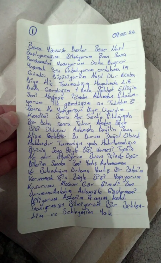 Güncel, 2026.02.12 16:57Market çalışanına duygularını mektupla ifade eden askerin mektubu genç kız tarafından sosyal medyada paylaşıldı. Mektubu okuyan kullanıcılar ikiye bölündü; bazıları mektuptaki nezaketi överken bazıları özel bir yazının paylaşılmasını eleştirdi.