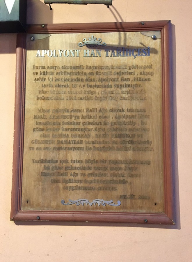 16. yüzyılda inşa edildiği bilenen bu hanın Cumhuriyetin ilk yıllarında Hancı Halil önde gelen otelcilerden biriymiş. Bugün ayakta olan Apolyont Han dışında Zincirli ve Hamurcu hanlarının da sahibiymiş. Ayrıca Bursa İstanbul arasında posta işlerini yürüten, gönderilerin Bursa'nın ilçelerine dağıtımını sağlayan bir kişiymiş. Bursa valisi Ahmet Vefik Paşa'nın da kullandığı Landon marka fayton o dönemde Bursa'nın en lüks faytonu olduğu için tüm düğün cemiyetlerini düzenleyen kişiymiş Atlardan, at malzemelerinden ve arabalardan çok iyi anlayan bir esnaf.