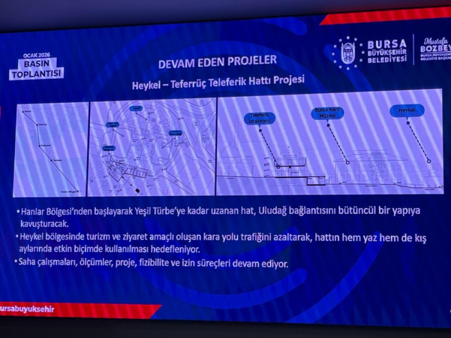 Toplantının en dikkat çeken başlığı ise Heykel-Teferrüç Teleferik Hattı oldu. Hanlar Bölgesi'nden başlayıp Yeşil Türbe'ye uzanması, oradan da Uludağ bağlantısıyla bütüncül bir ağ oluşturması hedeflenen bu proje, "ulaşım" başlığı altında sunulsa da asıl vurgunun turizm olduğu açık.