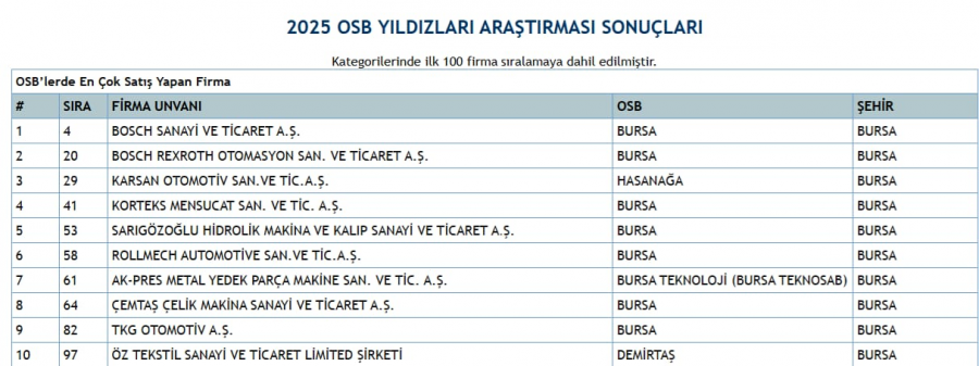 Bursa OSB'lerinde faaliyet gösteren firmaların, Türkiye sıralamasındaki birçok kategoride üst basamaklarda öne çıktığını görüyoruz.